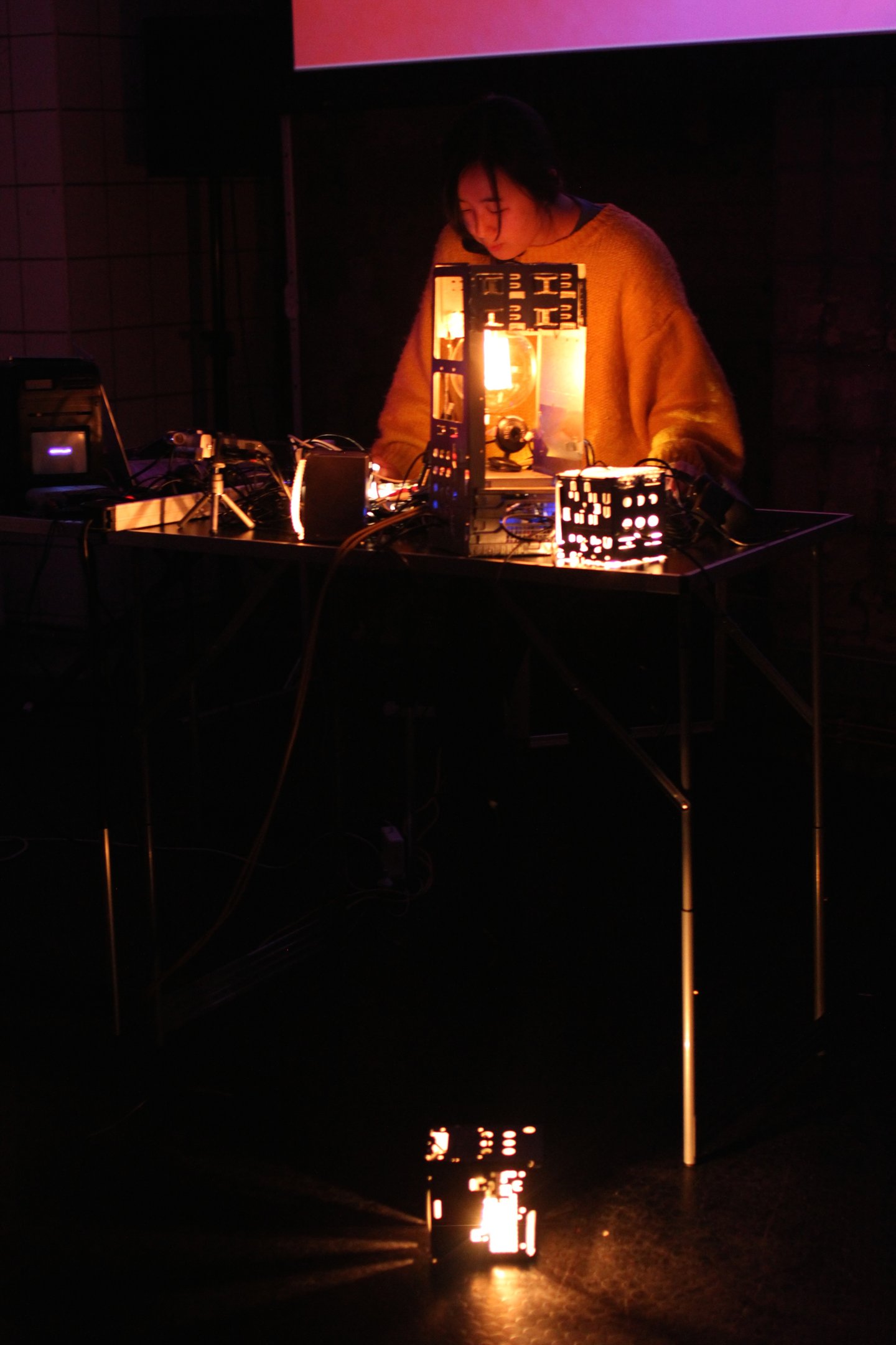 Breath is an interactive light and sound installation/performance, operated by human breath. As a wind instrument, this work has been developed to control sound and light with human breathing, made of DIY circuits and e-wastes. Breath uses amorphous energy from the human body and transforms it into different shapes: breathe to light and sound, vitalising an inorganic object. Human respiration is visualised by dimming bulbs, activates the machine and involves functioning. The piece has been made of electronic junks such as old telephone*s microphone and old PC*s metal frame to illustrate new life from the dead devices and to allude a transformable relationship between human and machine.